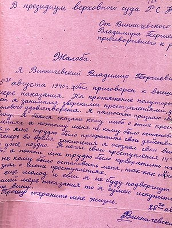 28 августа Винничевский подает жалобу в президиум Верховного суда РСФСР, в которой, признаваясь в совершенных злодеяниях, умоляет сохранить ему жизнь. Бесполезно.