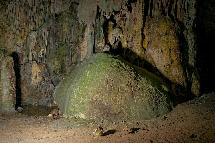На самом дне этой спиральной пещеры находятся бесчисленные сталактиты и сталагмиты, что делает ее похожей на гигантский собор. На стенах до сих пор можно обнаружить надписи: «Бонифас», «Делен», «Галан» – это все фамилии бывших здесь и, вероятно, погибших солдат. Здесь же выцарапаны и символы стремления к свободе – лодка, крест, парус… Ряд этих надписей и рисунков, выбитых в скале, прекрасно сохранились, будучи «запечатанными» кальцитом. Многие сохранились не так хорошо, и исследователям придется изучать их с помощью инфракрасных или ультрафиолетовых лучей.