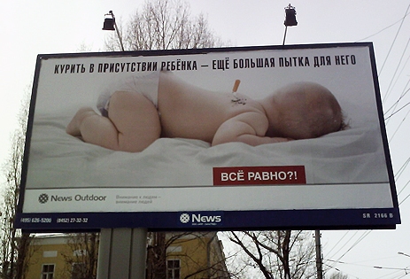 На рекламных щитах в Москве фотография младенца в подгузнике, и о его спину кто-то затушил сигарету. И мелкими буквами строчка о вреде курения.