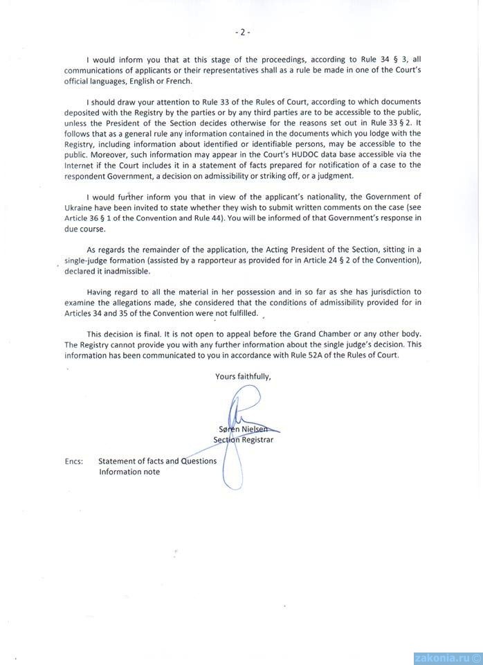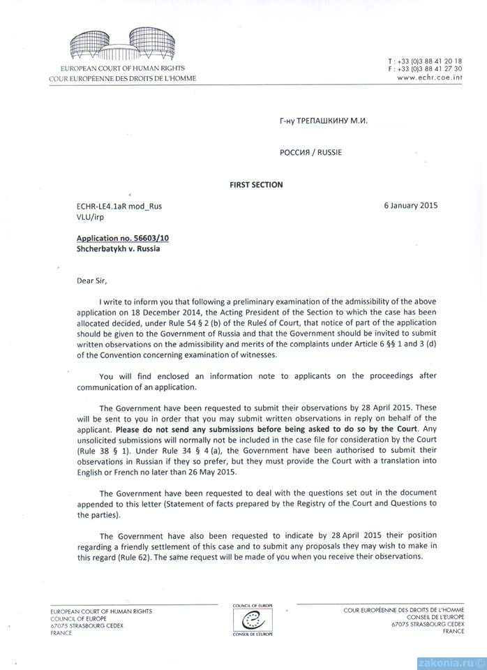 признана приемлемой по статьям Европейской Конвенции по защите прав человека: