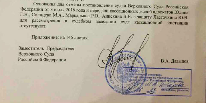 «Оснований для отмены постановления судьи Верховного Суда Российской Федерации от 8 июля 2016 года и передачи кассационных жалоб адвокатов Юдина Г.Н., Солнцева М.А., Маркарьяна Р.В., Анискина В.В. в защиту Ласточкина Ю.В. для рассмотрения в судебном заседании суда кассационной инстанции отсутствуют».