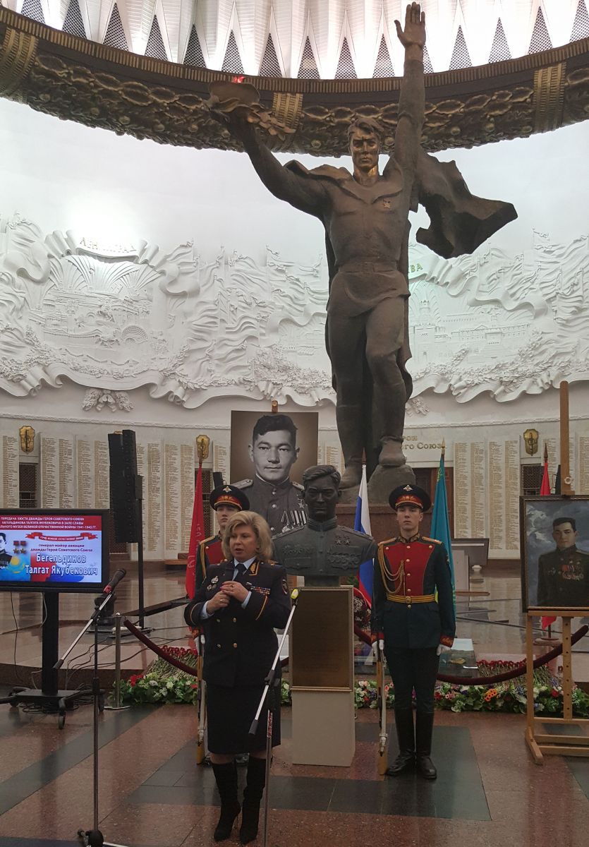 Сегодня в Зале Славы Центрального музея Великой Отечественной войны на Поклонной горе состоялись торжественная передача и установка бронзового бюста дважды Героя Советского Союза, летчика-штурмовика, генерал-майора авиации Талгата Бегельдинова. Автор бюста скульптор Мурат Мансуров из Астаны, сообщает корреспондент «ЗАКОНИИ».