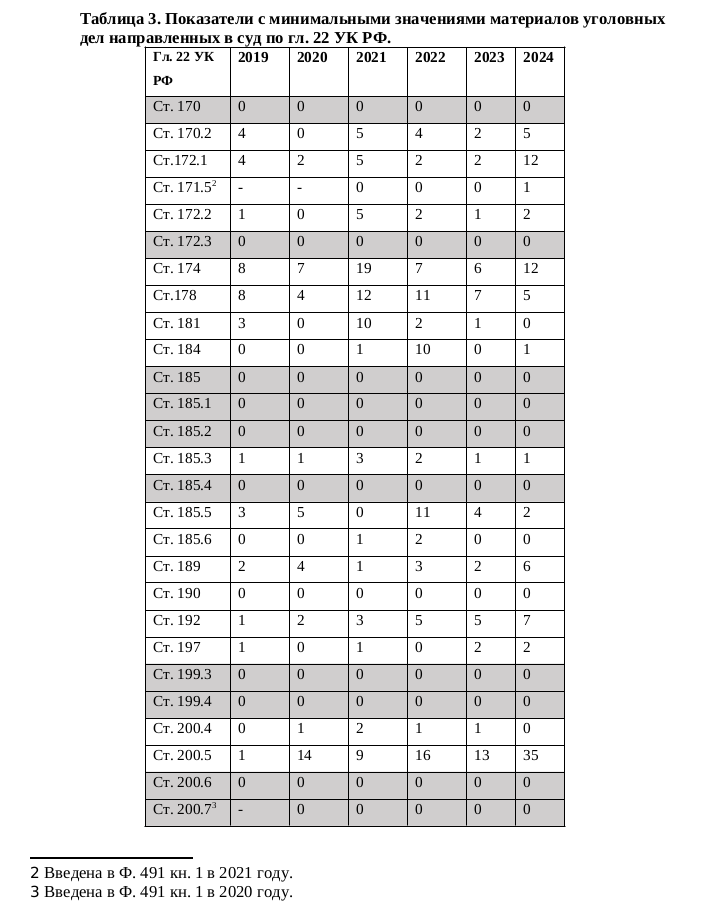 Проводя исследование, Татьяна Молчанова подчеркнула, что, возможно, критический уровень латентности экономических преступлений связан с их сложными и требующими специальных знаний технико-юридическими особенностями. Из-за чего отдельные составы, связанные со сложными финансовыми операциями или требующие специальных экономических экспертиз, практически не выявляются правоохранительными органами, что находит свое выражение в «нулевых» показателях официальной статистической отчетности. Так, с 2019 по 2024 год не выявлено, не расследовано и не передано в суды ни одного дела по таким статьям УК РФ, как регистрация незаконных сделок с недвижимым имуществом (ст. 170), незаконные производство и (или) оборот этилового спирта, алкогольной и спиртосодержащей продукции, табачной продукции, никотинсодержащей продукции и сырья для их производства (ст. 171.3.), большинство статей в части преступлений на рынке ценных бумаг, а также страхования. На нулевой отметке также находятся введенные в 2020-2021 гг. статьи о заведомо ложном экспертном заключении в сфере закупок (ст. 200.6.) и подкуп арбитра (третейского судьи) (ст. 200.7.)