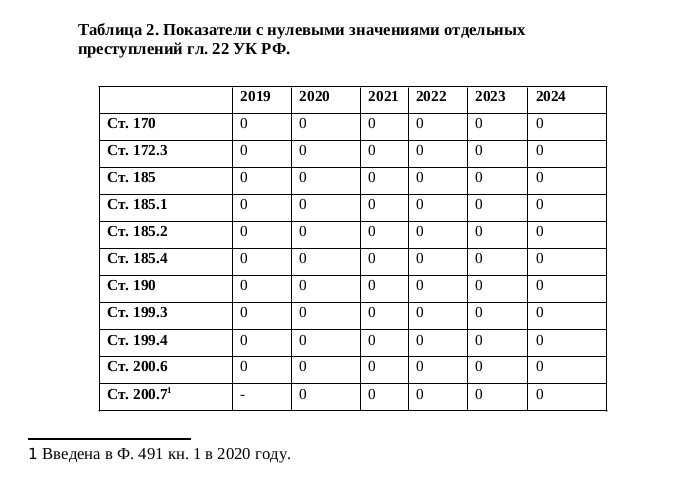 3. Каковы основные факторы, обуславливающие «нулевые» статистические показатели по отдельным составам преступлений, предусмотренным гл. 22 УК РФ? (См. Таблицу 2)