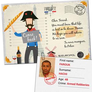 Так, на открытке, представляющей Францию, изображен усатый дядька-полицейский, держащий в руке знаменитый французский багет, а у ног его стоит бутылка вина. В другой руке бравый флик держит плакат с надписью: «Вернись!». Эта открытка адресована некоему Фаруку Аши, лидеру жестокой бандитской группировки, находящемуся в бегах. «Дорогой Фарук, – пишется в открытке, – ты должен знать, что лучше жить в прекрасной Франции. Мы надеемся, что ты вскорости к нам вернешься. Полиция».
