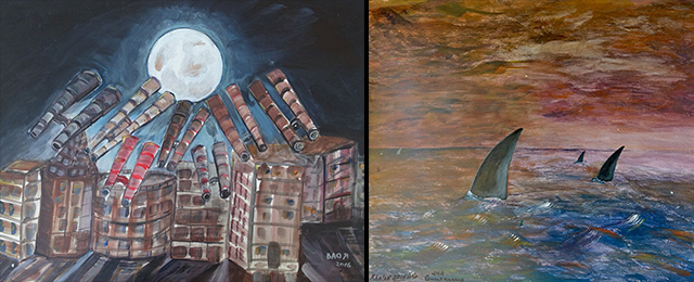 Но самыми привлекательными темами остаются море, бесконечный океан, лодки… даже если все это остается наименее видимым для заключенных, запертых в зданиях, поверх которых установлены брезентовые тенты. Лишь изредка ураганы уносят прочь эти экраны. Как объясняет йеменец Мансур ад-Айфи, слова которого приводятся в каталоге выставки, море «означает свободу, которую никто не может ни контролировать, ни присвоить, свободу для всех».
