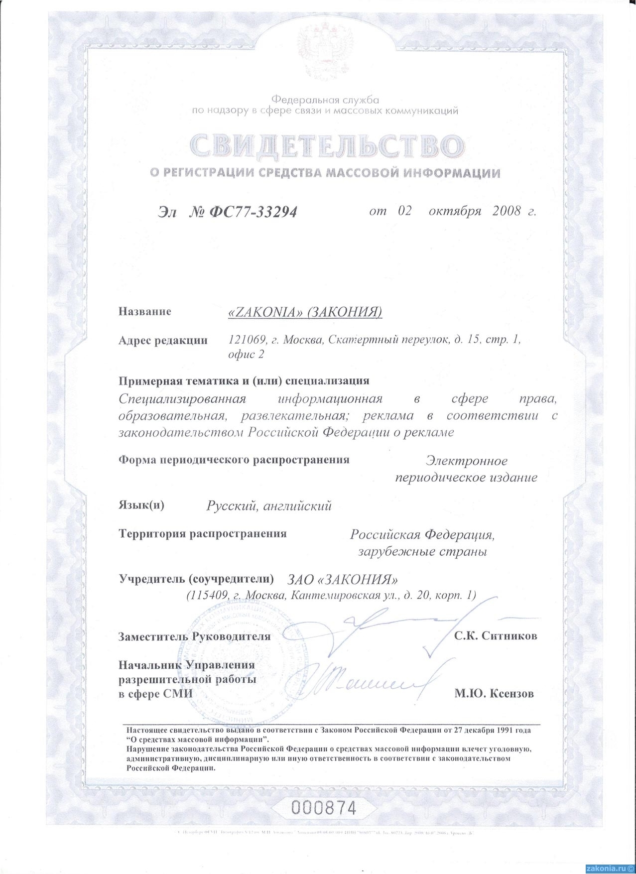 «ЗАКОНИЯ» - электронное СМИ (лицензия от 02.10.08 Эл.№ФС77-33294). «ЗАКОНИЯ» является официально уполномоченным Министерством юстиции Российской Федерации электронным ресурсом, проводящим мониторинг правоприменения в сети Интернет для представления его результатов Президенту России В.В. Путину.