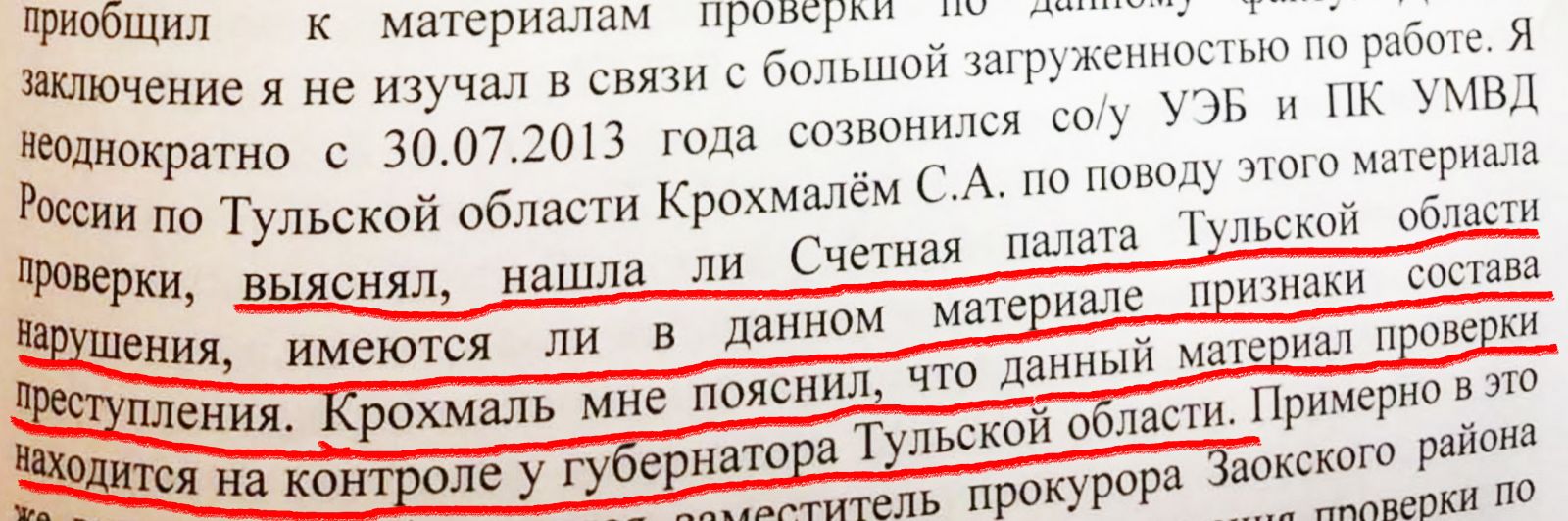 28 октября 2013г. руководитель Следственного управления Следственного комитета по Тульской области генерал-майор Сергеева Т.А. рассмотрела рапорт оперуполномоченного ОВД УЭБ и ПК УМВД России по Тульской области Крохмаля С.А. и постановление зампрокурора Тульской области о направлении материалов проверки № 203-164 пр-13 в орган предварительного расследования для возбуждения уголовного дела.