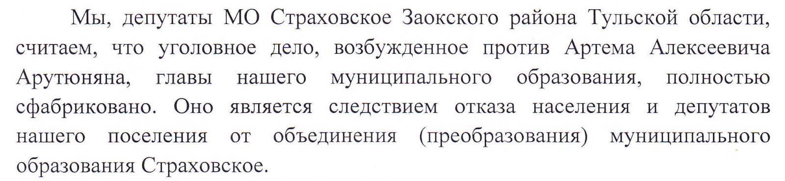 22.07.13г. Артем Арутюнян писал прокурору Тульской области О. Чернышу: «В настоящее время силы областной и районной администраций направлены на принудительное сложение депутатами своих полномочий. На личных приемах заместитель губернатора Марьясова Ю.А. открыто говорила о возбуждении уголовных дел в отношении меня и сотрудников администрации МО Страховское в случае несложения депутатских полномочий» (6 июня 2013г. на заседании Собрания депутатов МО Страховское Заокского района при рассмотрении вопроса о досрочном прекращении полномочий депутаты приняли решение своих полномочий не складывать).
