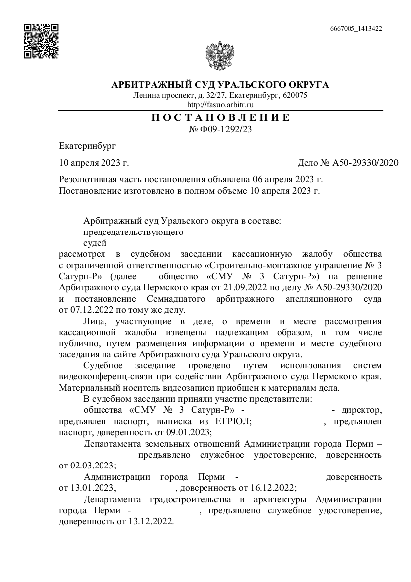 Арбитражный суд Пермского края в сентябре 2022 в удовлетворении требований отказал, Семнадцатый арбитражный суд в декабре того же года оставил решение без изменения. Постановлением Арбитражного суда Уральского округа в апреле 2023 года судебные акты нижестоящих инстанций отменены и дело направлено на новое рассмотрение – кассация признала фактическое изъятие земель Администрацией. В новом круге СМУ уточнило исковые требования, попросив помимо прочего взыскать с муниципального образования города Пермь убытки в связи с фактическим изъятием земель в размере более 338,5 млн рублей (рыночная стоимость 4,6 га + уплаченный земельный налог). В июне 2025 года первая инстанция в удовлетворении всех исковых требований отказала, по сути, перечеркнув определение кассации. Апелляция удовлетворила требования частично: в пользу СМУ взысканы убытки за уплаченный земельный налог (более 4,3 млн рублей), а администрация города обязывалась в месячный срок принять в муниципальную собственность безвозмездно спорные участки. Кассация «засилила» этот вердикт.
