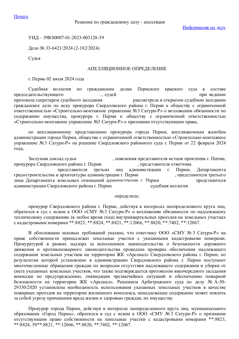 В 2024 году сразу два прокурора – города Перми и Свердловского района г. Перми, действуя в интересах неопределенного круга лиц, обратились к СМУ с двумя исками: о признании отсутствующим права собственности на приобретенные по ДКП земельные участки и о возложении обязанности по надлежащему техническому содержанию внутриквартальных проездов на поименованных земельных участках. То есть, с взаимоисключающими требованиями. Судами первой и апелляционной инстанций иск прокурора города (о непризнании права собственности) был оставлен без удовлетворения, иск районной прокуратуры удовлетворен, а апелляция в резулятивной части уточнила: «Исключить из мотивировочной части решения … выводы суда о способе защиты права путем изъятия земельных участков в муниципальную собственность с соблюдением соответствующей процедуры и выплаты выкупной цены».