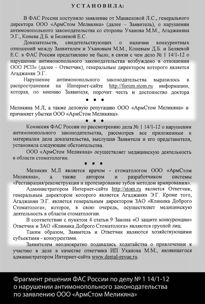 Характер и суть обсуждения на форуме dental-revue.ru методов лечения и протезирования зубов Меликсета Меликяна формируют его отрицательный образ как профессионала. Это, по мнению Меликяна, создает угрозу его деловой репутации как практикующего специалиста и возглавляемой им клиники, а также его предпринимательской деятельности в целом. В ФАС России направляются ходатайства ООО «АрмСтом Меликяна» о привлечении Михаила Уханова в качестве ответчика в уже рассматриваемом ведомством деле №1 14/1-12, а в дальнейшем к ответственности за нарушение антимонопольного законодательства в суде.