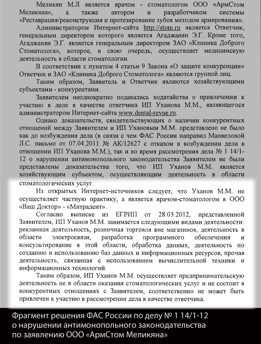 31.10.12 ФАС заключает: «ИП Уханов осуществляет предпринимательскую деятельность не в области оказания стоматологических услуг» и потому «не состоит в конкурентных отношениях с Заявителем». В привлечении Михаила Уханова к участию в рассмотрении дела в качестве ответчика заявителю отказано.