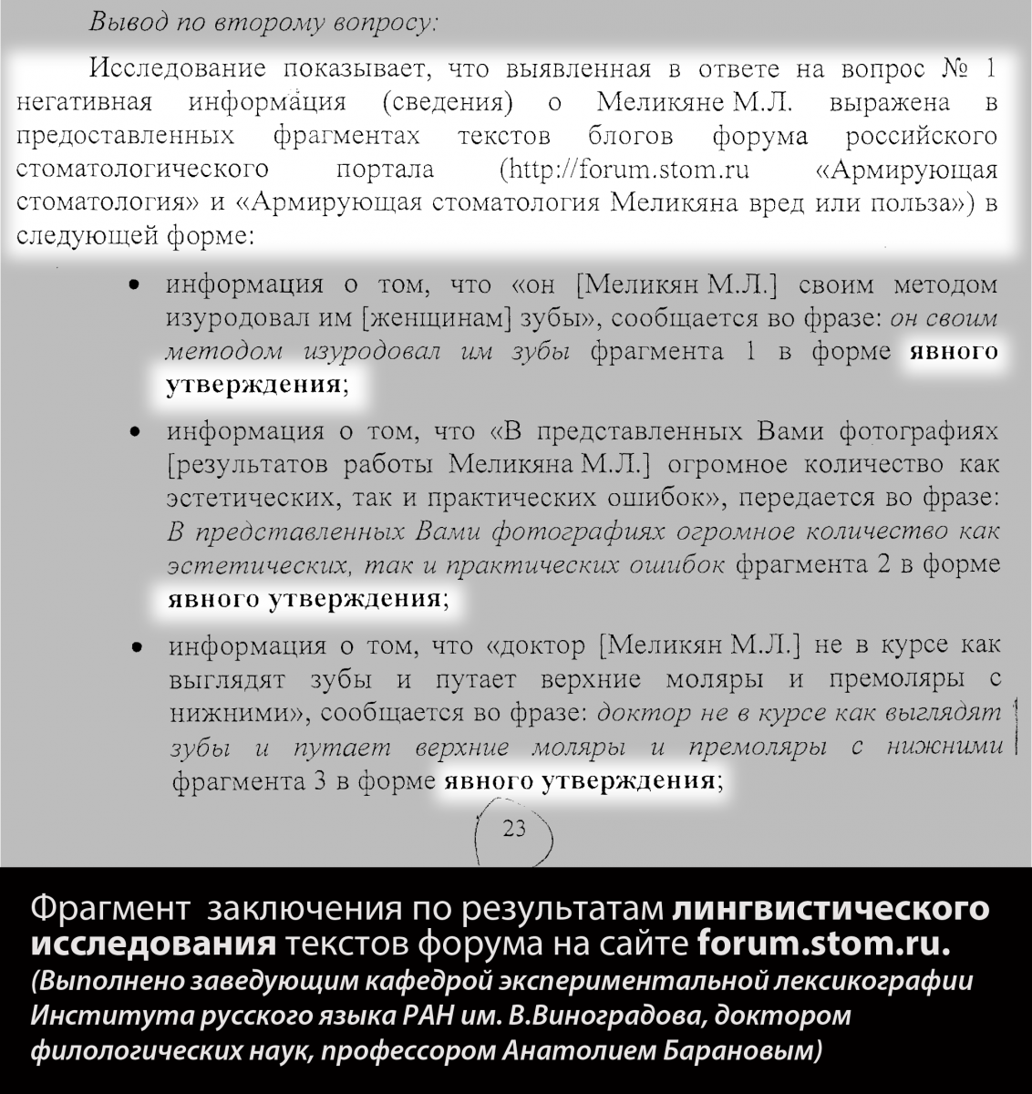 Согласно данному заключению, «проведенный семантический анализ предоставленных фрагментов текстов блогов форума российского стоматологического портала (http://forum.stom.ru «Армирующая стоматология» и «Армирующая стоматология Меликяна вред или польза») позволяет сделать вывод о том, что в них содержится негативная информация» о Меликяне и его работе (бред, ад, людей жалко, пипец, продавец гомна, и т.п., в ряде случаев откровенно неприличного характера).