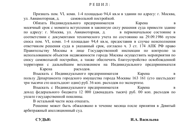 Индивидуальный предприниматель Карен З. в 2009 году приобрел нежилое помещение на первом этаже многоквартирного дома на улице Авиамоторная в Москве. Возводило помещение ООО «Мархистройпроект» в установленном законом порядке на основании необходимых разрешений и согласований, выданных, в частности, Комиссией по земельным отношениям и градостроительству префектуры ЮВАО города Москвы и Московским земельным комитетом. Межведомственная комиссия по использованию жилого фонда разрешила ООО «Мархистройпроект» произвести перепланировку арочных пространств жилого дома в соответствии с разработанным предприятием проектом, согласованным установленным порядком, на основании поручений Префекта ЮВАО города Москвы. Также распоряжением Префекта акт приемочной комиссии объекта был утвержден (все документы имеются в деле). После приобретения помещения Карен З. ничего в нем не менял и не перестраивал.