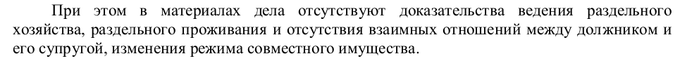 «При этом в материалах дела отсутствуют доказательства ведения раздельного хозяйства, раздельного проживания и отсутствия взаимных отношений между должником и его супругой, изменения режима совместного имущества».