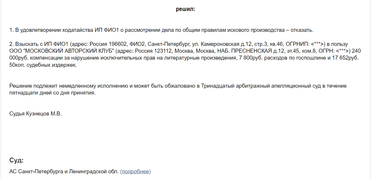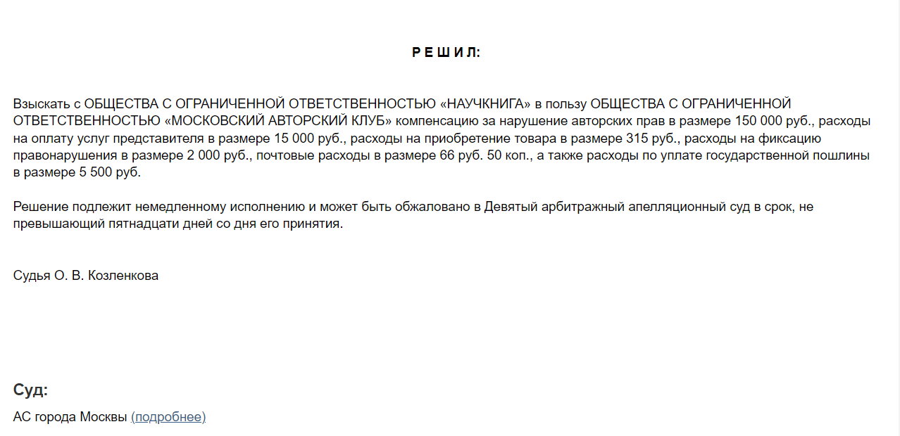 Резюмируя: если книга уже была введена в гражданский оборот путем ее неоднократной продажи или иного отчуждения, то исчерпание прав автора уже произошло. И еще момент – истец посчитал единицей авторского права не произведение в целом (книгу), а ее главы. И соответственно, насчитал себе компенсацию за каждую главу. Почему уж тогда не за каждый «гарик»? Вот бы озолотился.