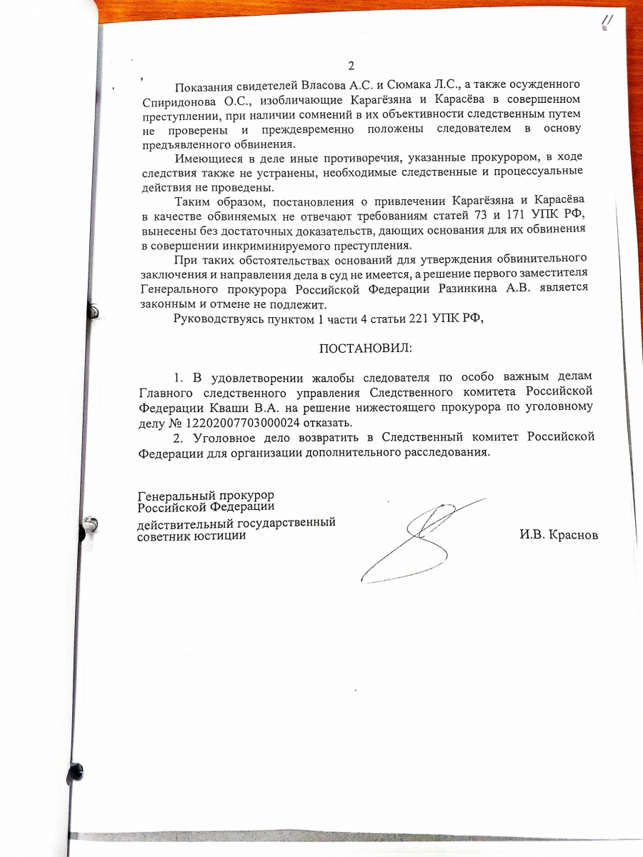 Генеральный прокурор Игорь Краснов в удовлетворении жалобы отказал, предварительное следствие по уголовному делу в отношении Карагёзяна и Карасёва возобновлено, им обоим продлено содержание под стражей.